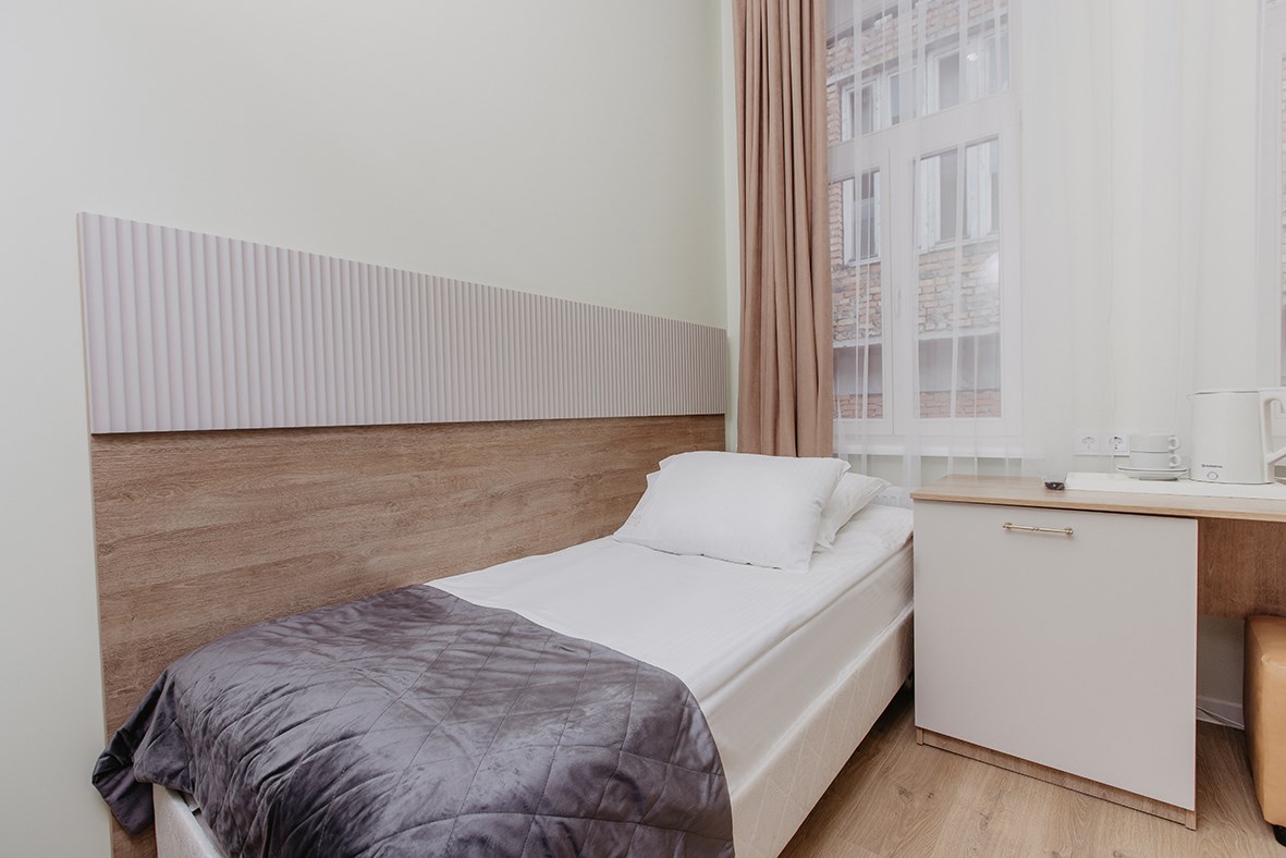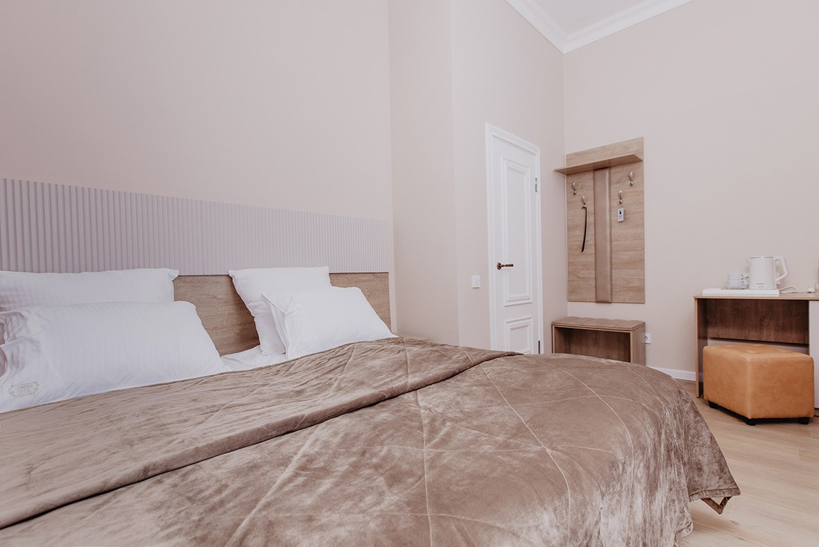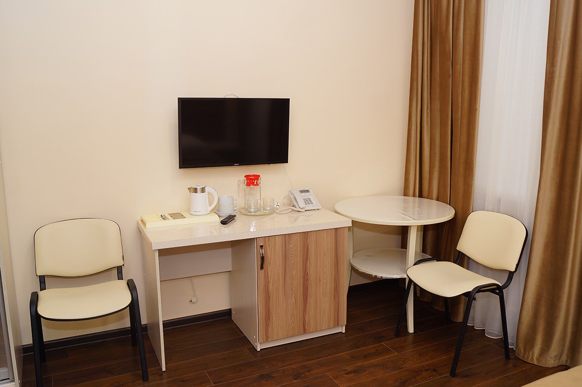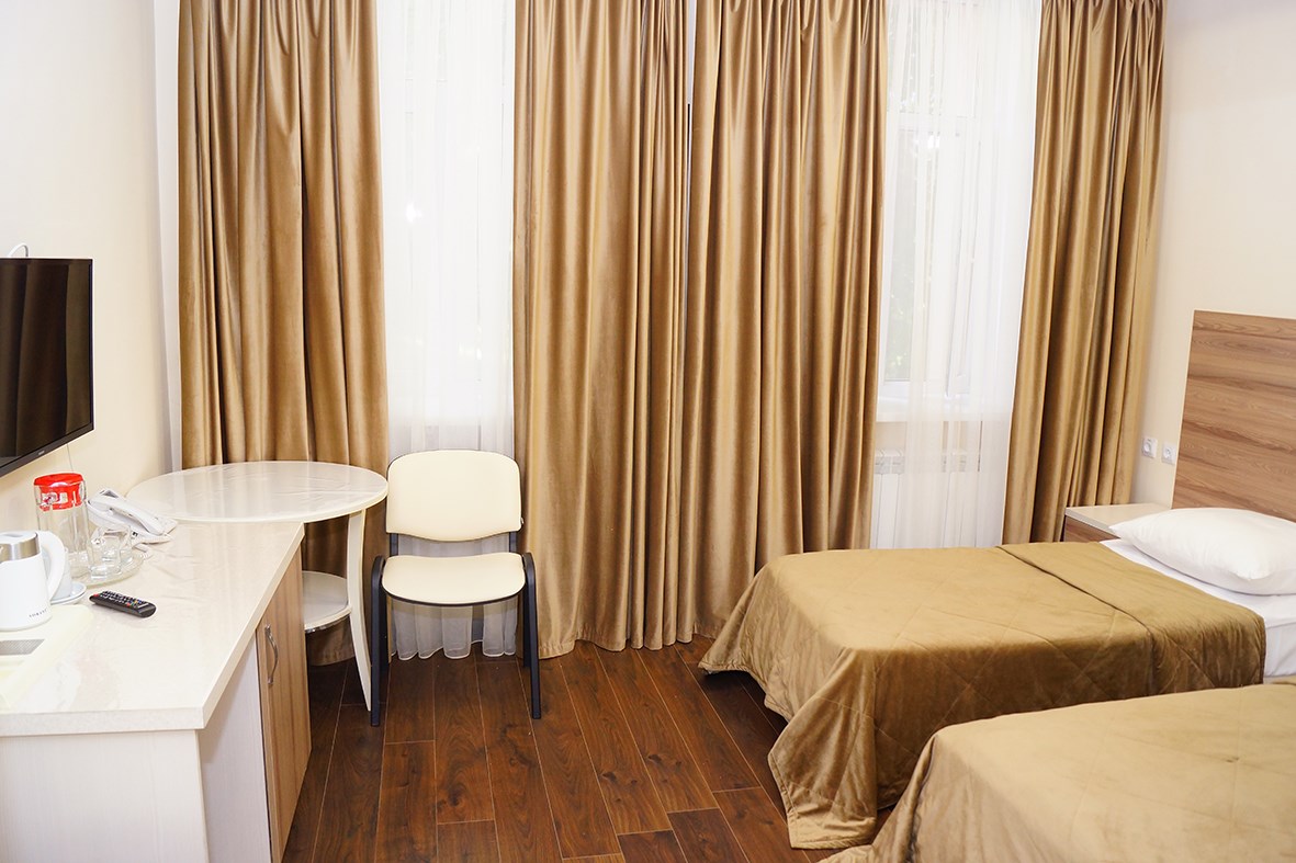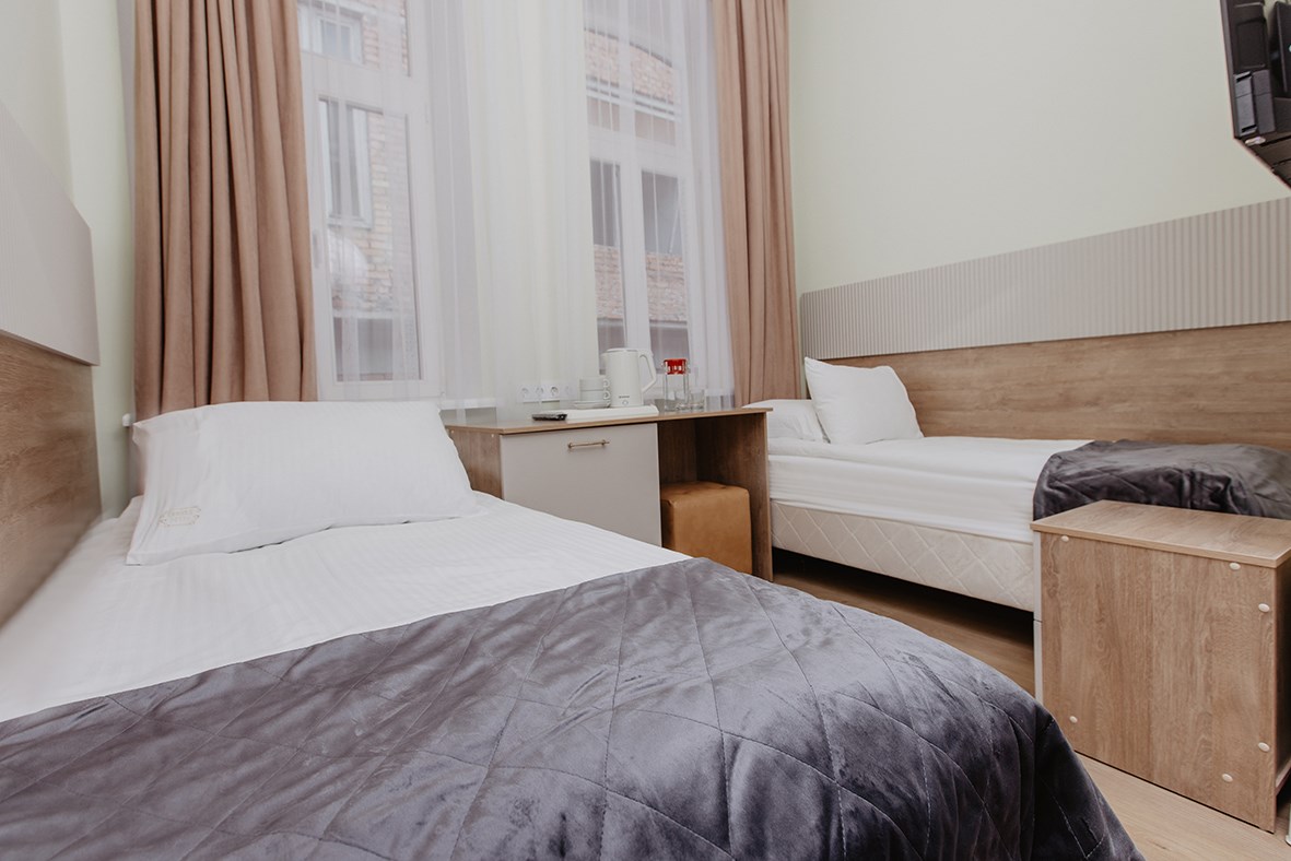 Площадь номера - 20-25 кв.м. 2 осн. места. 1 доп. место. Мебель: вешалка, зеркало, кровать двуспальная, кровать односпальная, прикроватные тумбочки, стол, стулья, шкаф. Оборудование: телевизор, телефон, чайный набор посуды, электрочайник. Санузел: с душем, туалетные принадлежности, фен. Сервис: Wi-Fi бесплатно, смена полотенец, смена постельного белья, уборка номера, услуги внутренней телефонной связи.