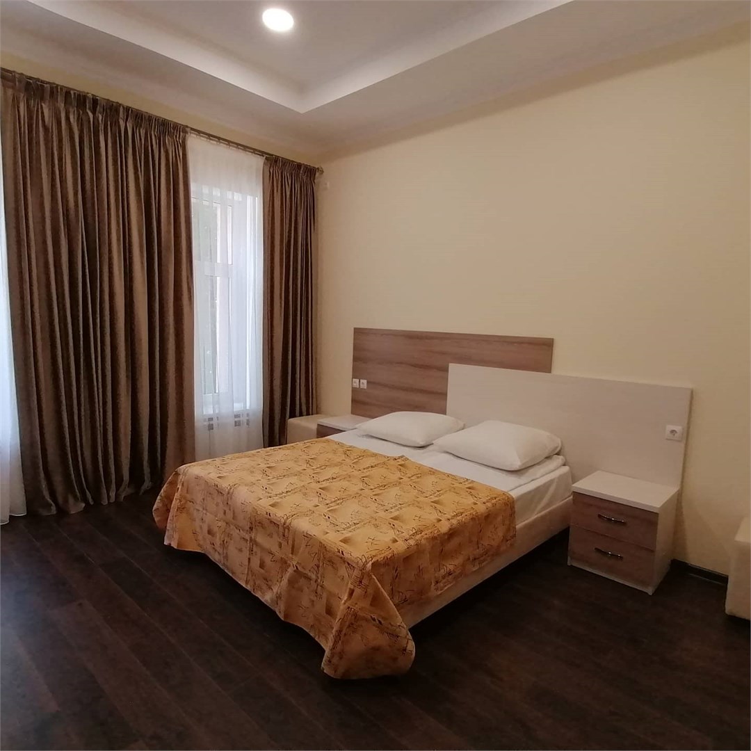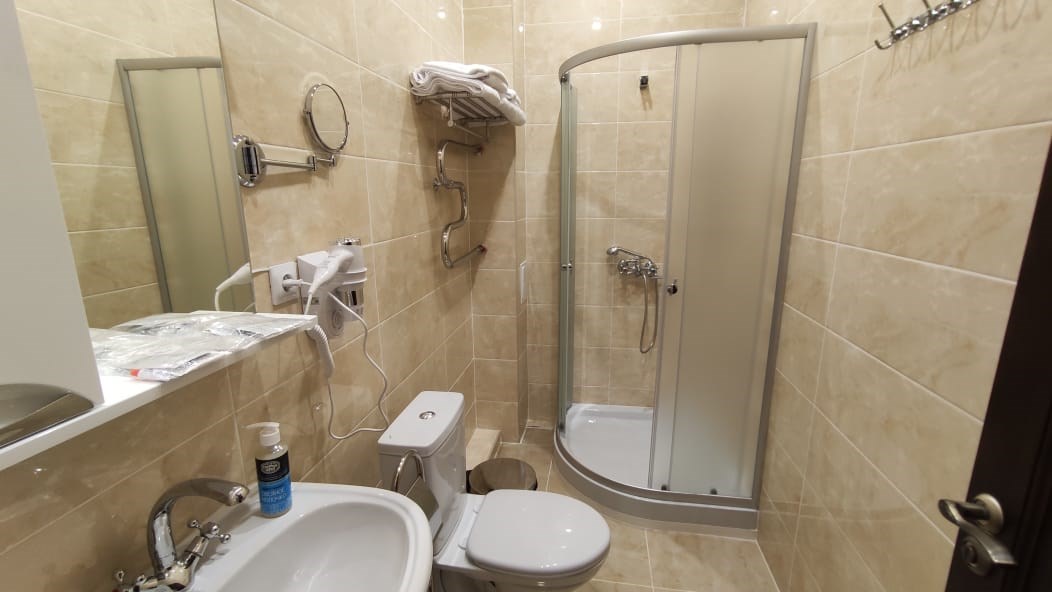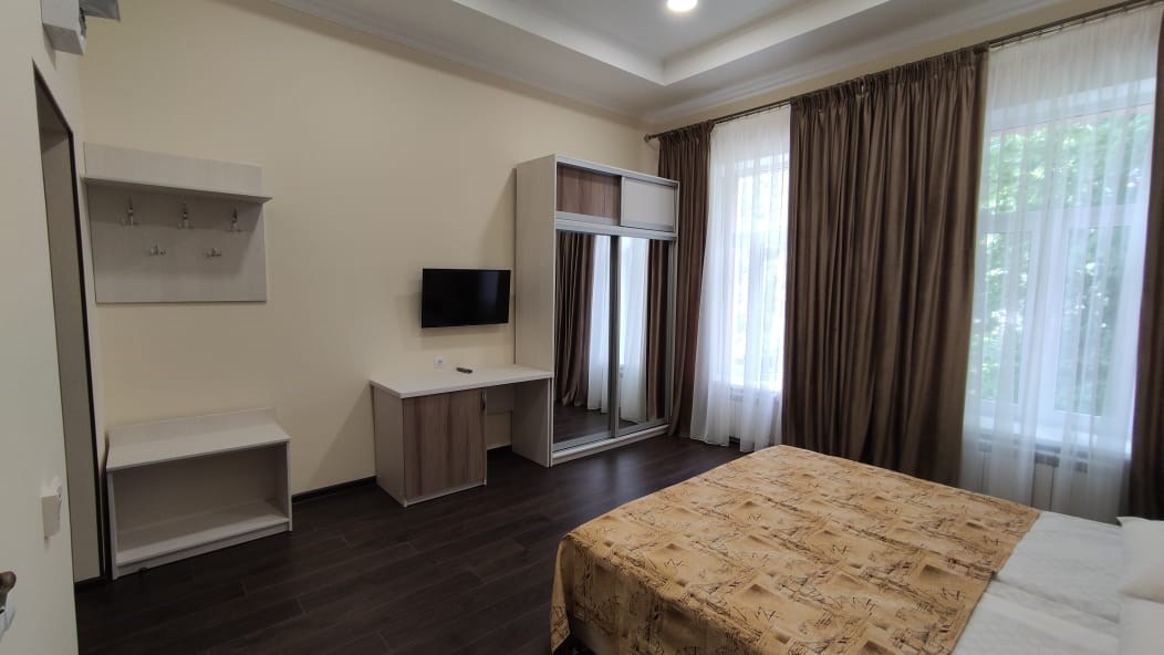 Площадь номера - 18 кв.м. 2 осн. места. 1 доп. место. Мебель: вешалка, зеркало, кровать двуспальная, прикроватные тумбочки, стол, стулья, шкаф. Оборудование: телевизор, телефон, чайный набор посуды, электрочайник. Санузел: с душем, туалетные принадлежности, фен. Сервис: Wi-Fi бесплатно, смена полотенец, смена постельного белья, уборка номера, услуги внутренней телефонной связи.