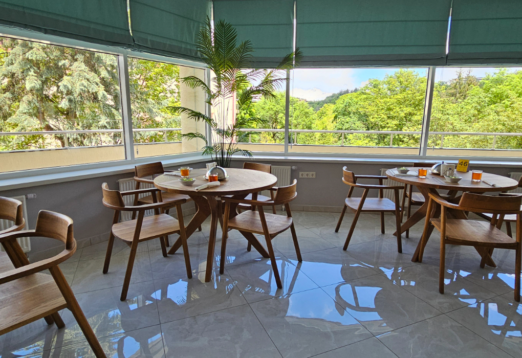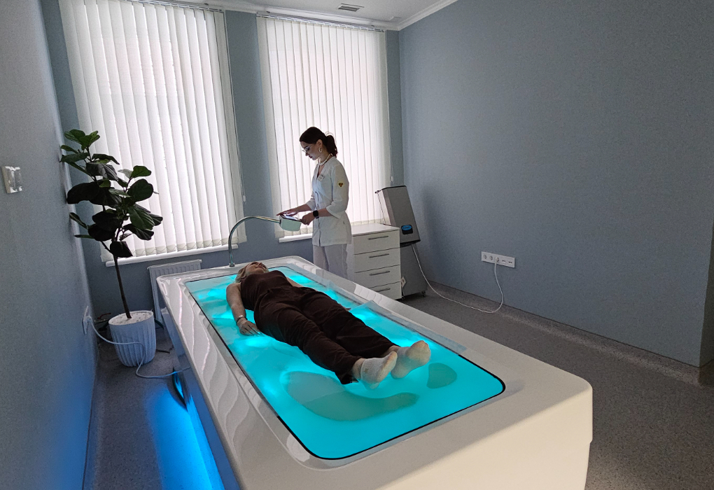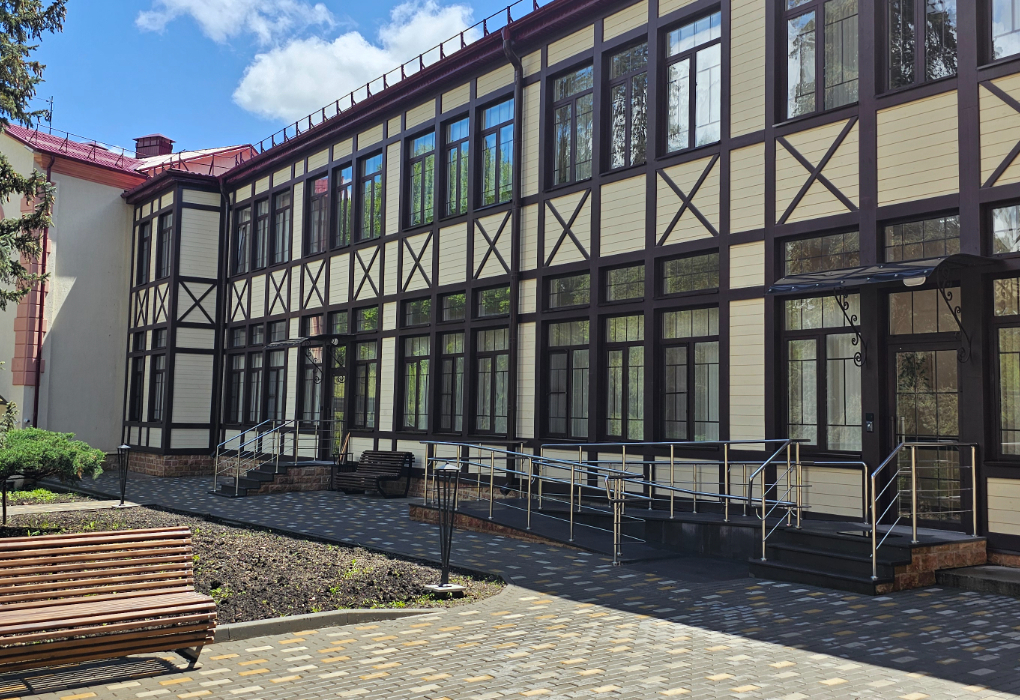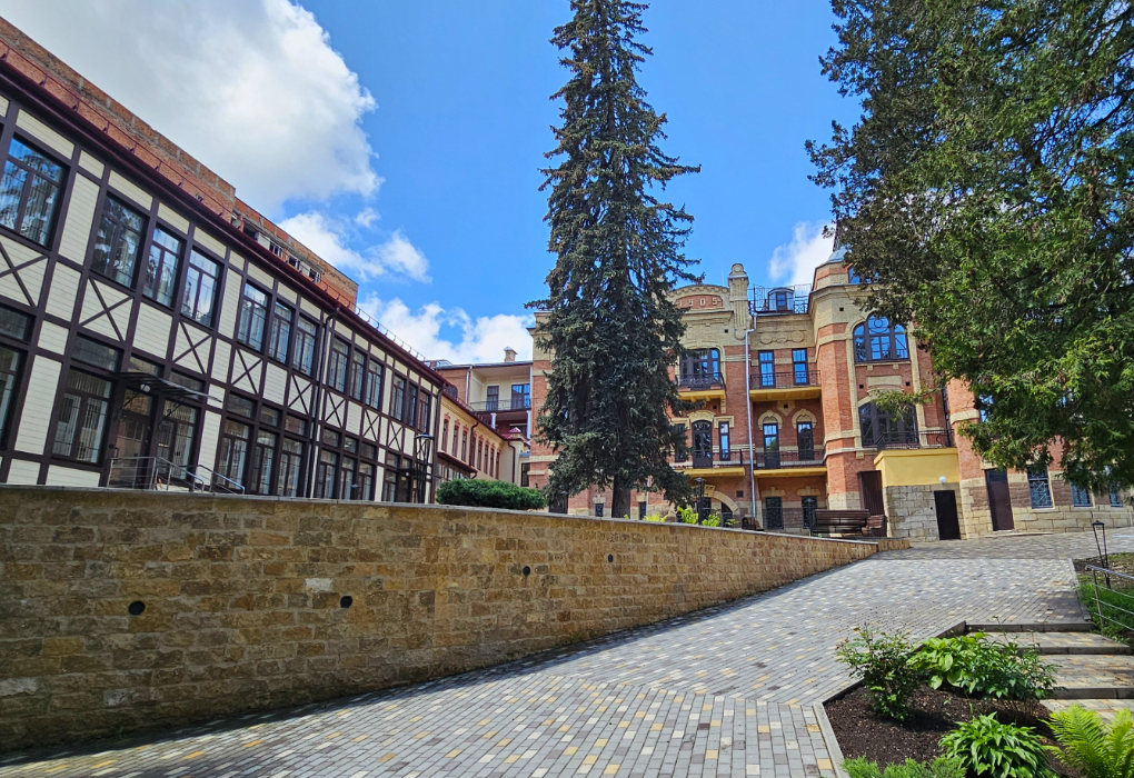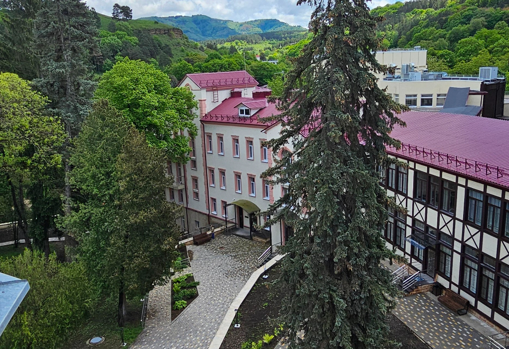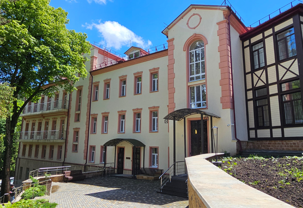 Клиника расположена в центре Кисловодска в трех минутах ходьбы от курортного парка. В пешей доступности — Нарзанная галерея, исторический и художественный музеи, рядом с клиникой работает несколько кафе и магазинов. За 5—7 минут можно доехать до железнодорожного вокзала, ближайший аэропорт в Минеральных Водах, примерно в 53 километрах от клиники. Комплекс состоит из 4 корпусов, расположенных на благоустроенной территории у западной границы курортного парка. Жилой фонд, рассчитанный на 130 человек, предлагает отдыхающим однокомнатные Стандарты и двухкомнатные номера улучшенной категории. В комнатах лаконичный интерьер и есть все необходимое для комфортного размещения — санузел с душевой кабиной, телевизор, электрочайник, холодильник, номера улучшенной категории оснащены кондиционером, в некоторых комнатах встречаются мебелированные балконы. В клинике работает столовая, также в распоряжении гостей беспроводной интернет и охраняемая парковка. Здравница специализируется на заболеваниях нервной системы и болезнях сердца и сосудов, поэтому включает в себя два лечебных отделения: неврологическое и кардиологическое. Своим гостям клиника предлагает различные современные методы лечения, в том числе и бальнеотерапию: жемчужные, хвойные и йодобромные ванны.
